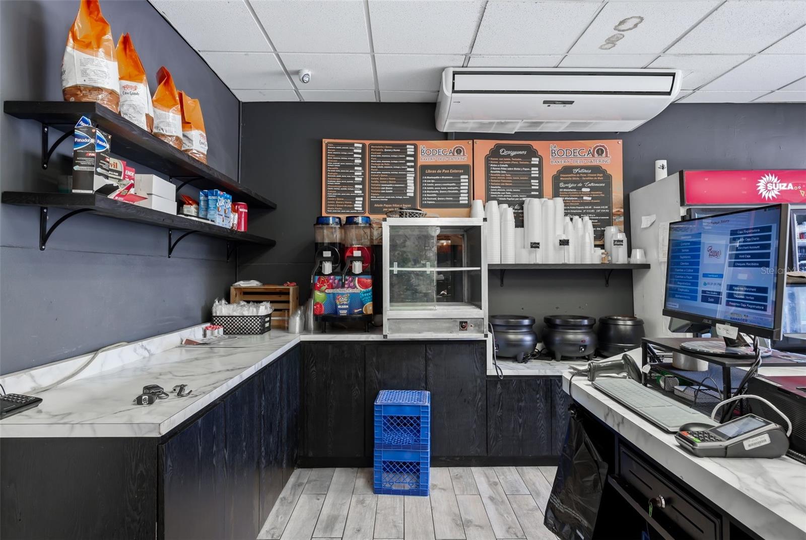 Turnkey business opportunity in Juncos: two established, contiguous operations transferring together under one owner — a bakery/restaurant and adjacent colmado (convenience store) — located in a high-traffic commercial center just off the Highway 30 exit, with abundant on-site parking.
