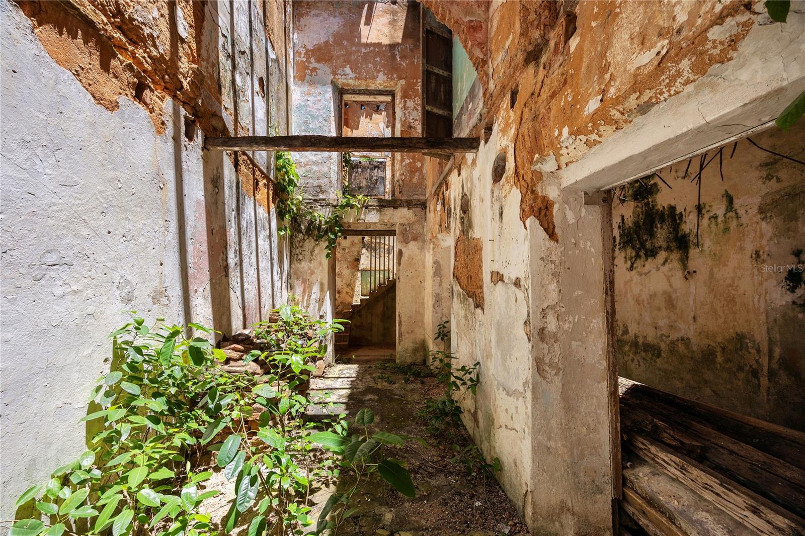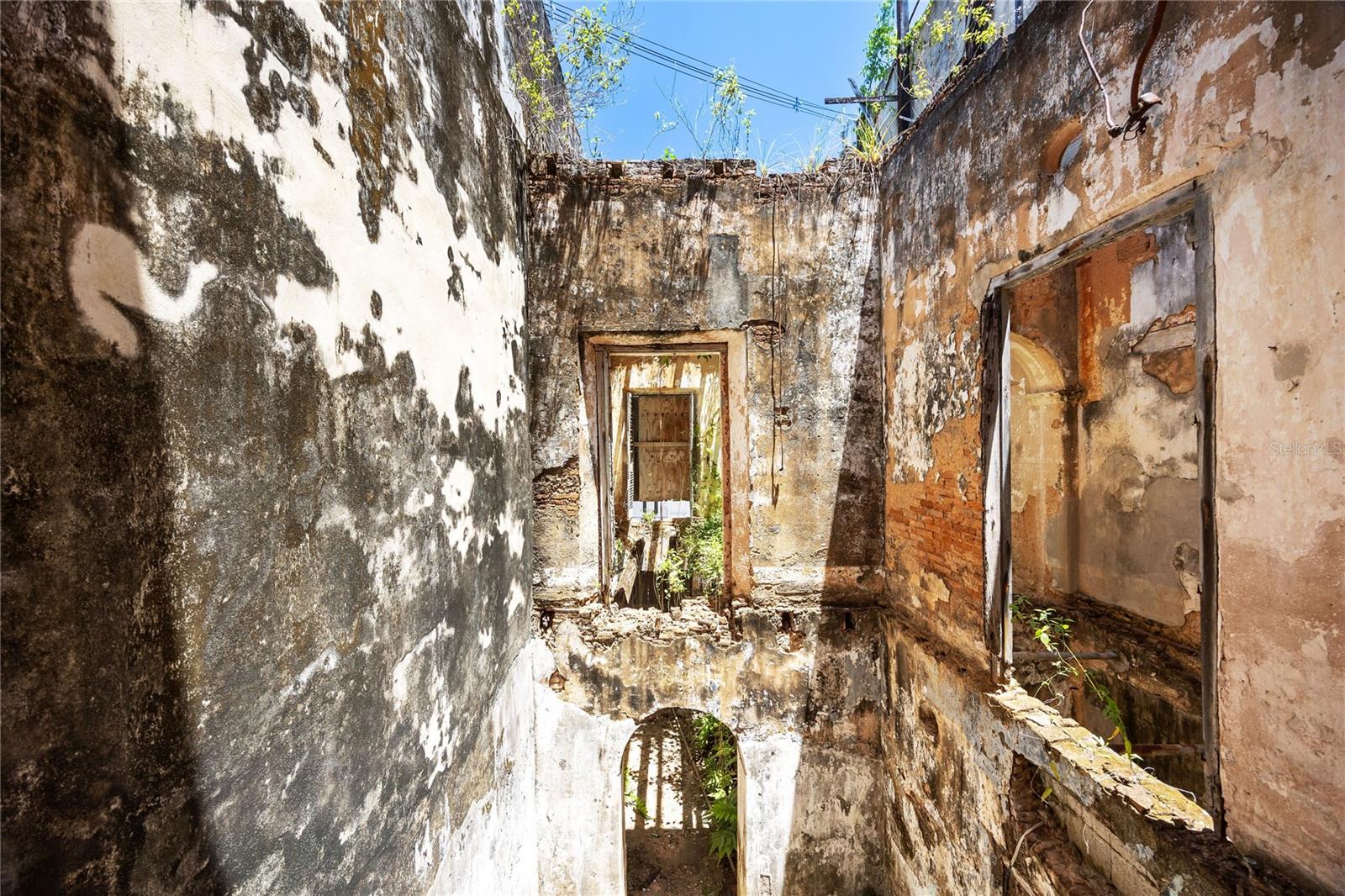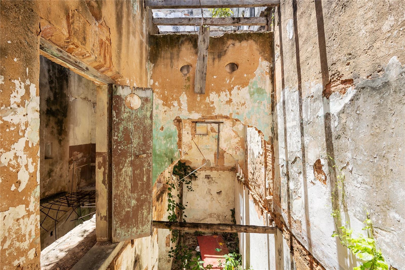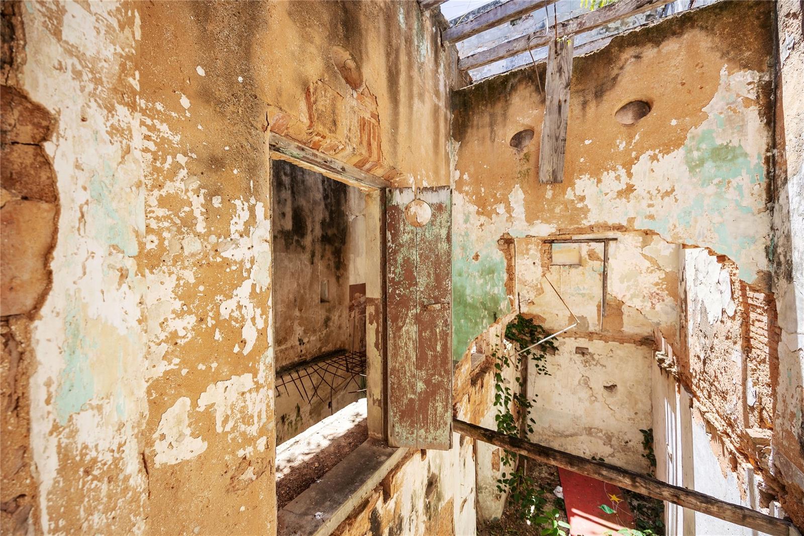 Inside, the atmosphere is unexpectedly still, almost reverent. Sunlight filters through the open volume where floors and roof once stood, illuminating textures shaped by time. Trailing vines, weathered plaster, exposed beams. The original courtyard opens dramatically upward, revealing the full height of the structure, while remnants of the staircase and upper levels remain visible, offering a striking sense of verticality and proportion. A space that holds memory, where architecture and nature have quietly intertwined.
