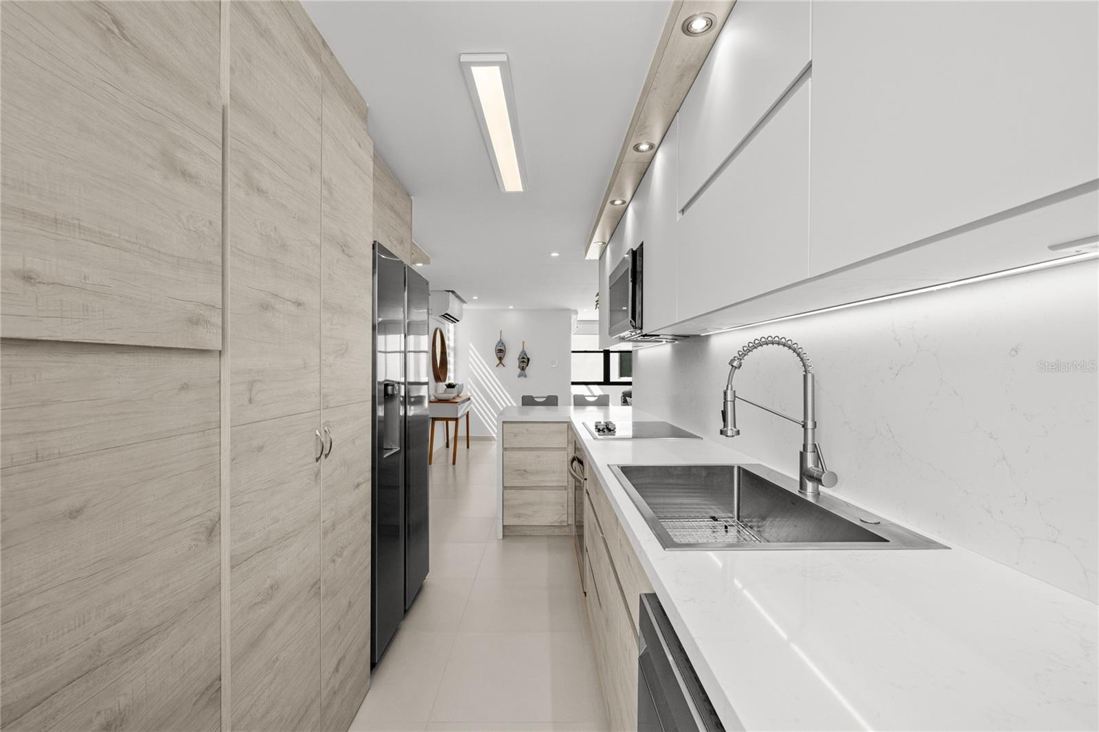 The kitchen is sleek and modern, with polished white marble countertops and cabinetry in a light wood grain that feels as effortless as it is modern. Both bathrooms echo this serene palette in natural textures, with sleek lines, polished fixtures, and the kind of gleaming cleanliness that makes the entire home feel untouched--because it is. You'll be the very first to live in this redefined residence.