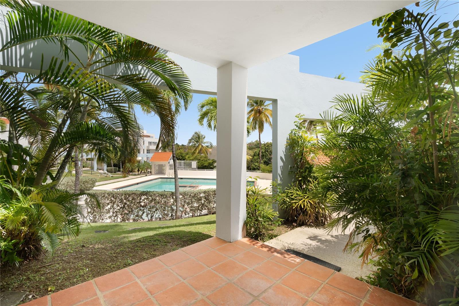 The interior layout is both functional and inviting, with a spacious living and dining area that connects seamlessly to the kitchen. From this level, doors open to a covered terrace and outdoor space, creating a natural extension of the home and allowing for immediate access to the pool area just steps away.