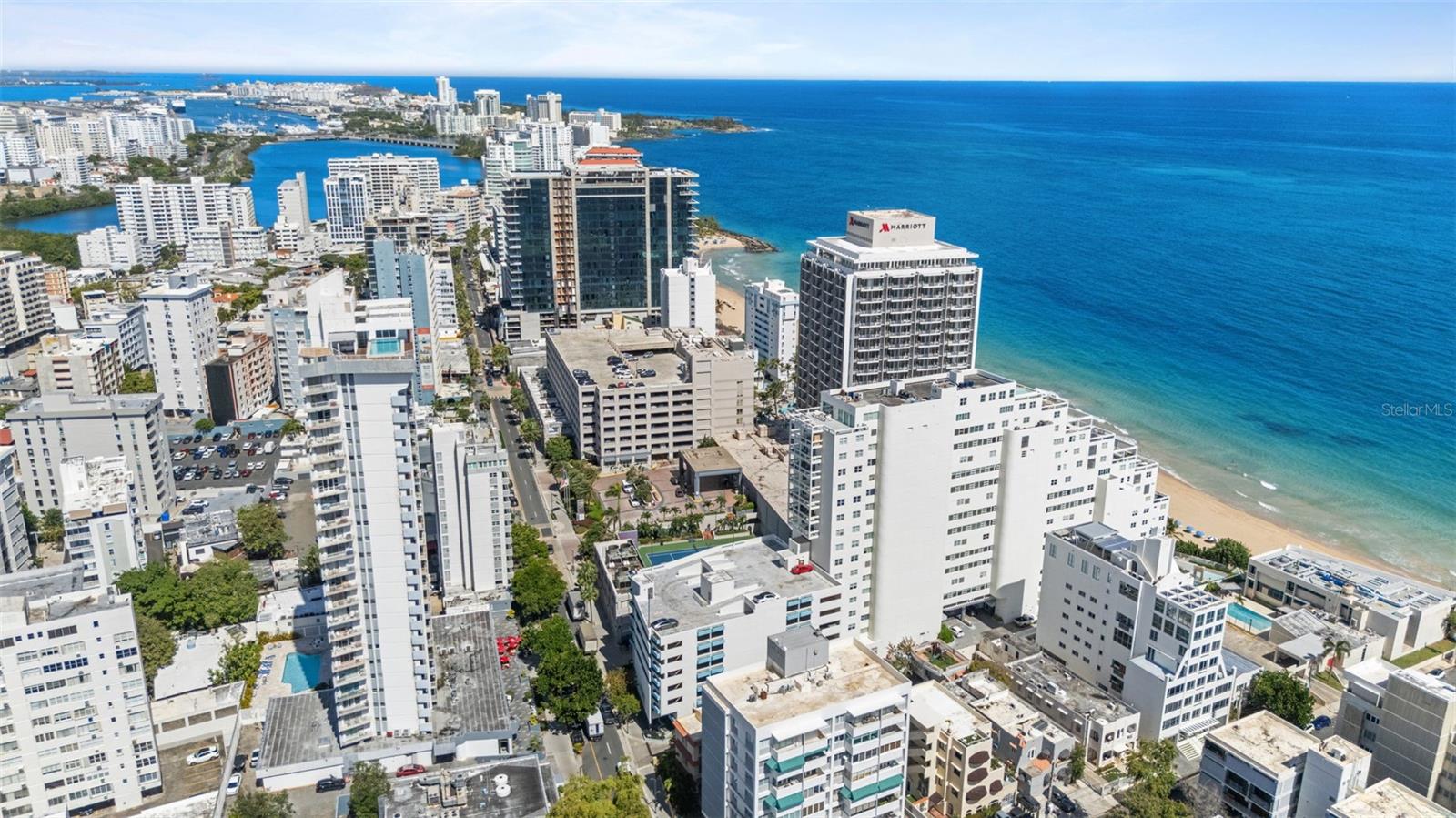 Drive along Avenida Ashford toward the east; the building is located on the ocean side between major hotels and residential towers. Between Condado Avenue and Calle Cervantes, adjacent to Marriott Hotel. Building with aqua blue accents