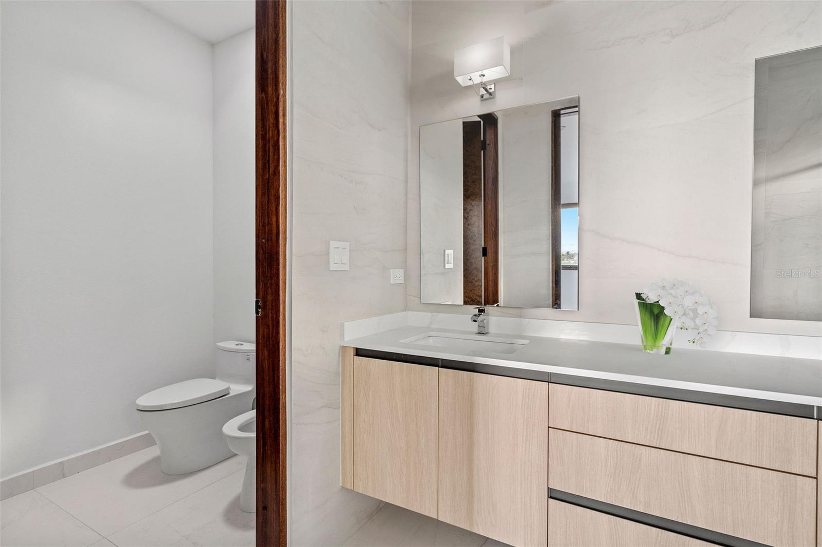Ideal for any of your culinary pursuits, the functional and luxurious kitchen features an oversized center island, a breakfast bar, a walk-in pantry, a wine cellar, and plenty of storage seamlessly designed with high-quality cabinetry, warm color palettes and white quartz countertops. Nestled in a 1,378 SM Corner lot, the interiors cohesively connect to the the exterior covered terrace framing captivating views of the golf course, serene lakes, and the picturesque El Yunque National Rainforest.